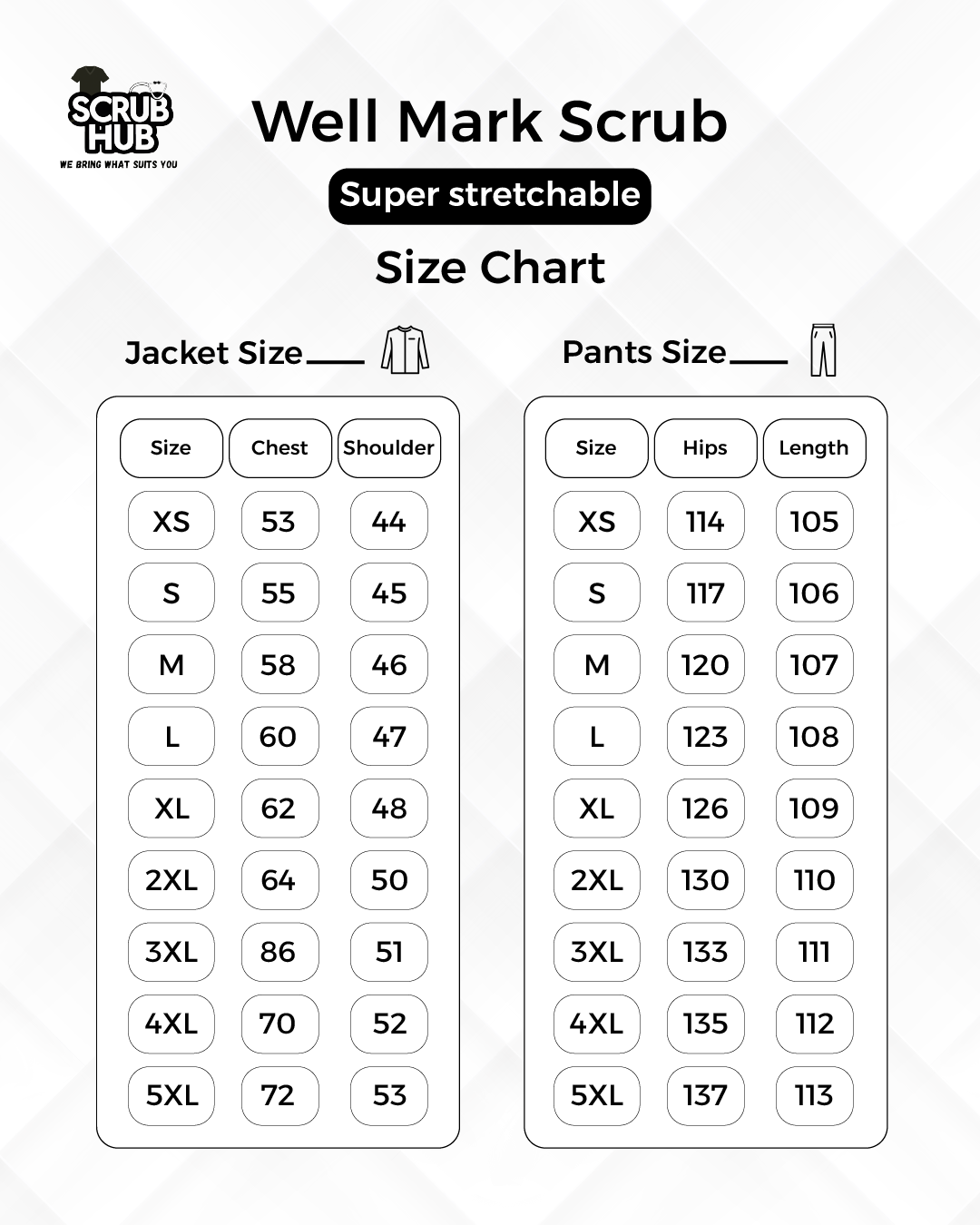 XS, S, M, L, XL, 2XL, 3XL, 4XL, 5XL
